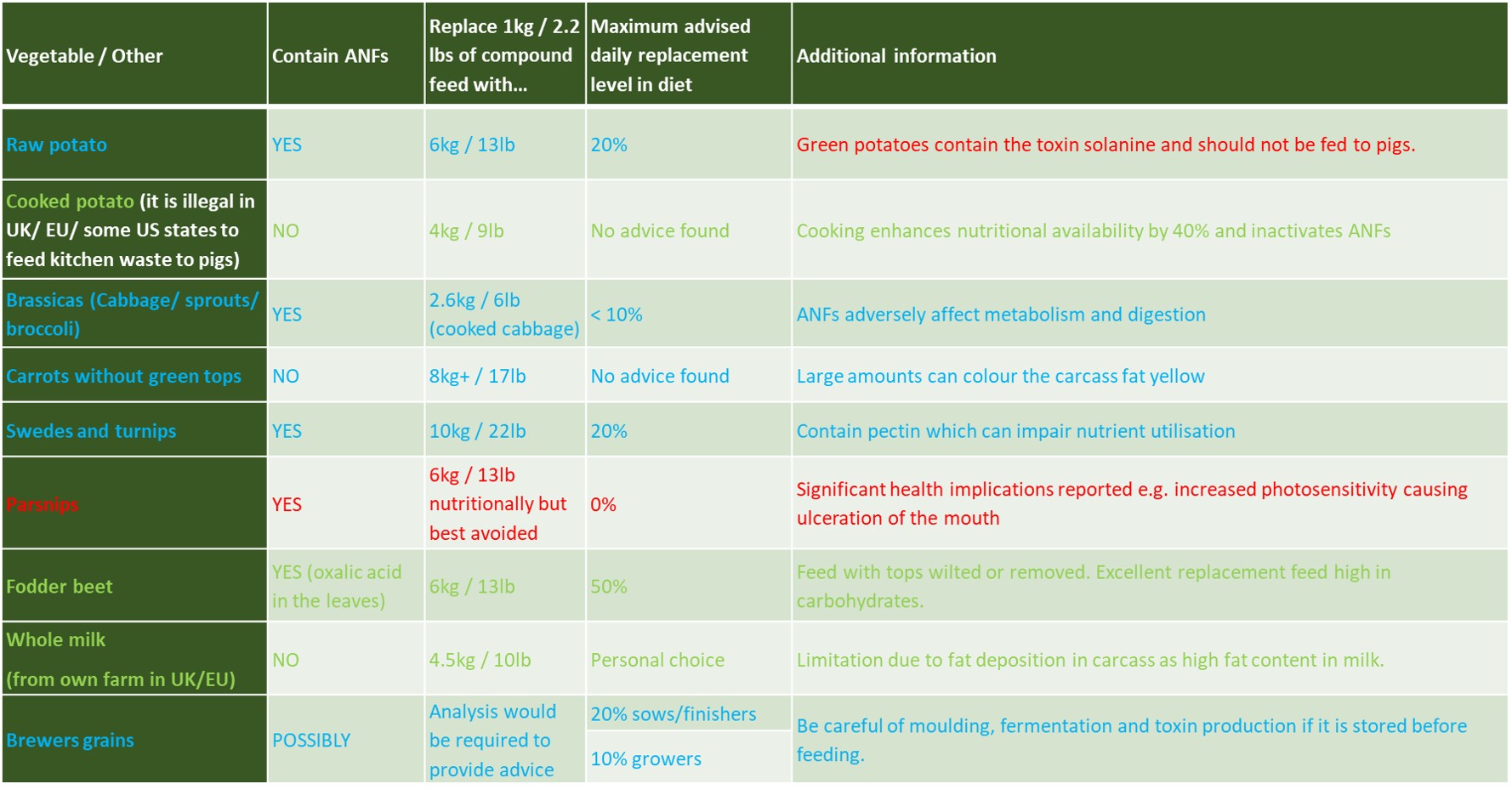 Some vegetables have been clinically proven to have a negative effect upon a pig’s protein digestion capability and some can even cause clinical illness.