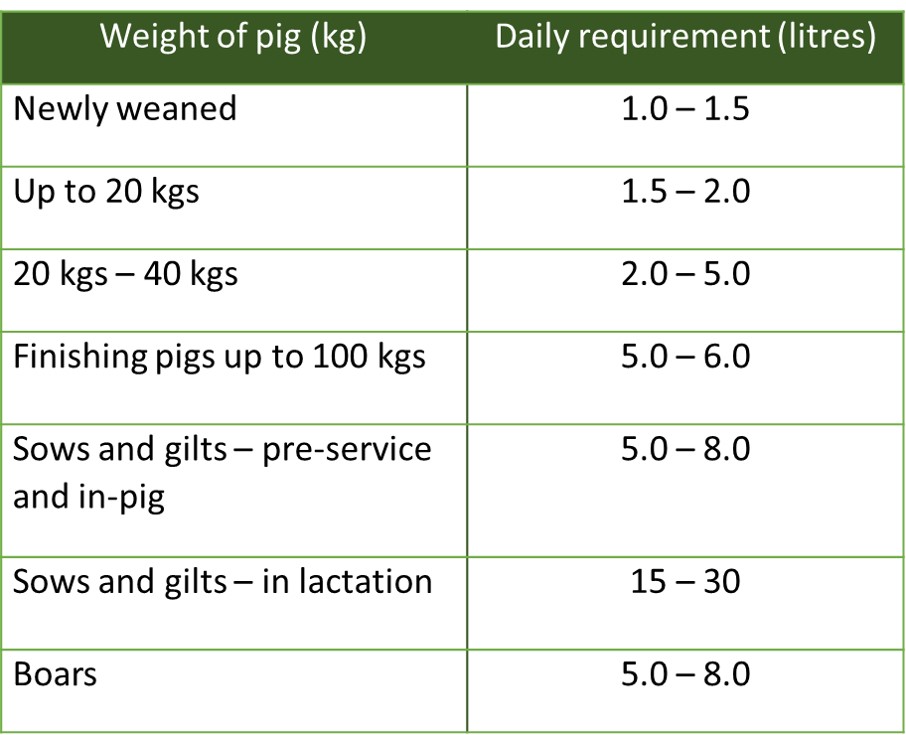 This intake-output balance is directly affected by a multitude of factors including age; what they’re fed and crude protein content of their feed; weather conditions/ climate; health status; provided wallows and type of husbandry (indoor/ outdoor) – so the quantity required cannot be quoted in absolute litres. The recently published Code of Practice for the Welfare of Pigs (England) provides a guide on the minimum quantities consumed in a temperate climate (Table 1) but a continuous supply of potable water is the aim. Potable being the key word here – not contaminated with faeces or urine, including relying on streams as a source of drinking water as these may be contaminated from further upstream.