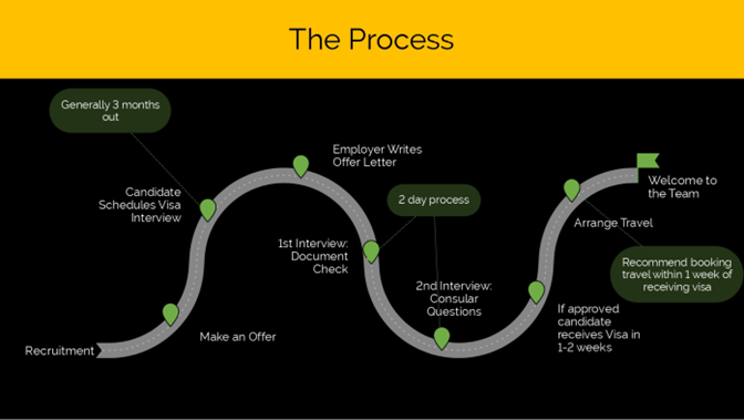 - The candidate schedules their visa interview. The candidate does not have to schedule the interview herself/himself; the employer is able to schedule for them. Currently, Rock said appointments are scheduling about three months out. Candidates can monitor appointments online and sometimes get their appointments moved up.
