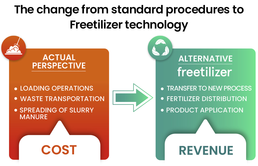 and development. Freetilizer offers a solution that not only eliminates bad odours, immaturation issues and nutritional imbalances. It also allows the simultaneous production of a solid and a liquid fertilizer, creating the opportunity to enter the organic fertilizer market with a wide range of options and possibilities. With this approach transportation becomes part of the fertilizer business and spreading is the responsibility of the farmer.