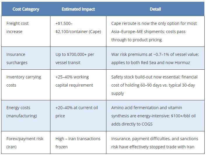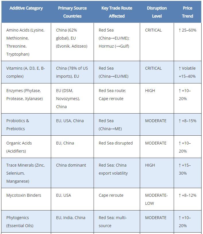 US tariffs of 25% on Chinese feed additive imports (effective 2024–2025) add a regulatory layer on top of the logistics cost surge