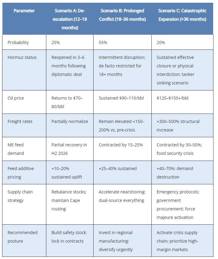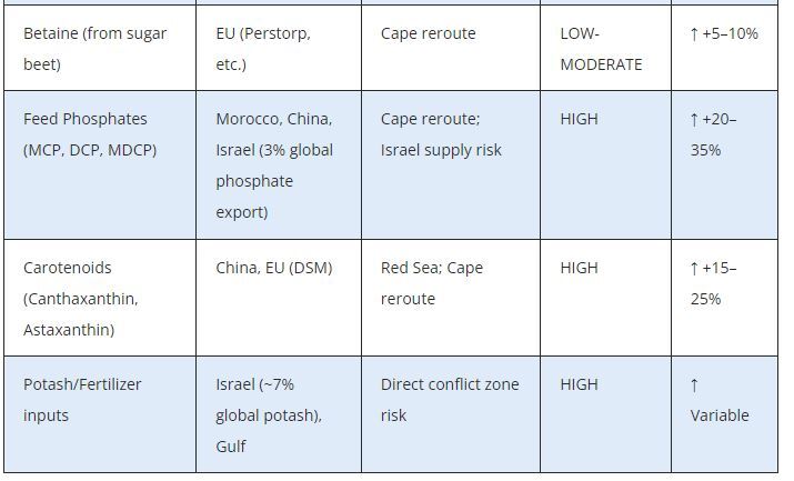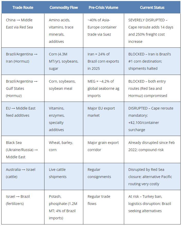 The Middle East conflict has triggered one of the most significant and concurrent disruptions to agricultural trade, energy supply, and global logistics in recent history. For feed additive companies, the compounding effects of the Red Sea/Bab el-Mandeb closure, the newly disrupted Strait of Hormuz, rising oil prices, supply chain rerouting, and shifting demand patterns in the world’s fastest-growing feed markets constitute both immediate operational risk and medium-term strategic opportunity.