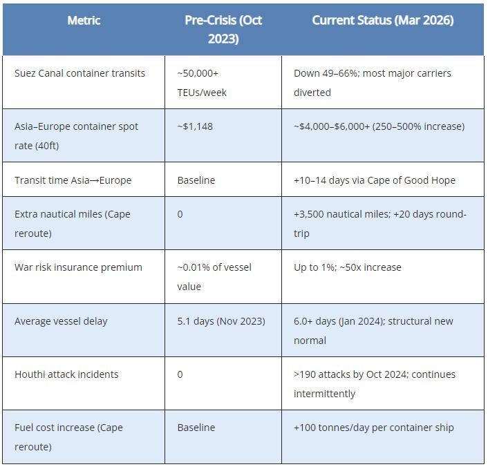 A 40-foot container from China to Europe now costs ~$4,000–$6,000 vs. $1,148 pre-crisis – a 250–500% increase