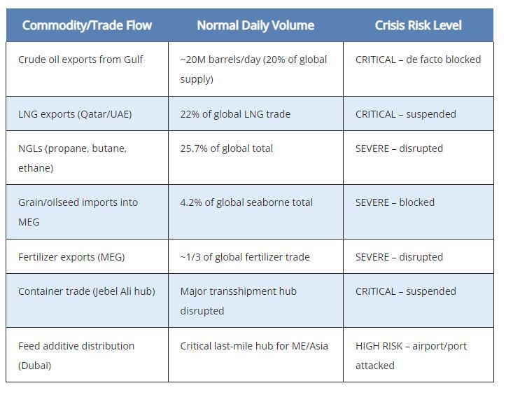 The simultaneous closure of both the Red Sea/Bab el-Mandeb and the Strait of Hormuz represents an unprecedented ‘double sea blockade’ scenario for Middle Eastern grain and feed importers. Gulf nations with food reserves of 3–6 months face acute shortages if the crisis extends beyond Q2 2026.