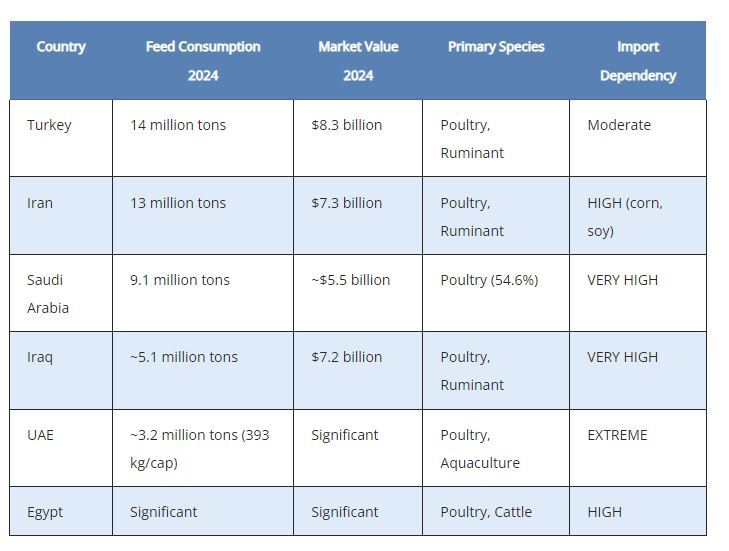 The Middle East and Africa account for approximately 5.9% of world compound feed production, with ~75 million tons/year. The Middle East animal and pet feed market alone was valued at $53.2 billion in 2024, consuming 63 million tons. The region is a net feed importer, heavily dependent on seaborne commodities – a structural vulnerability now severely exposed.