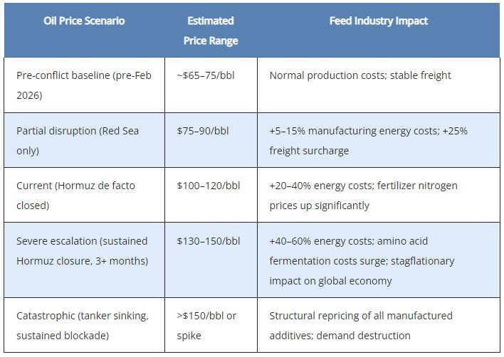 Oil prices are the most important cross-cutting variable for the feed additive industry. Nearly all manufacturing inputs – fermentation energy, synthesis energy, transport – are sensitive to oil/gas prices. The Strait of Hormuz crisis has created a direct energy cost shock: