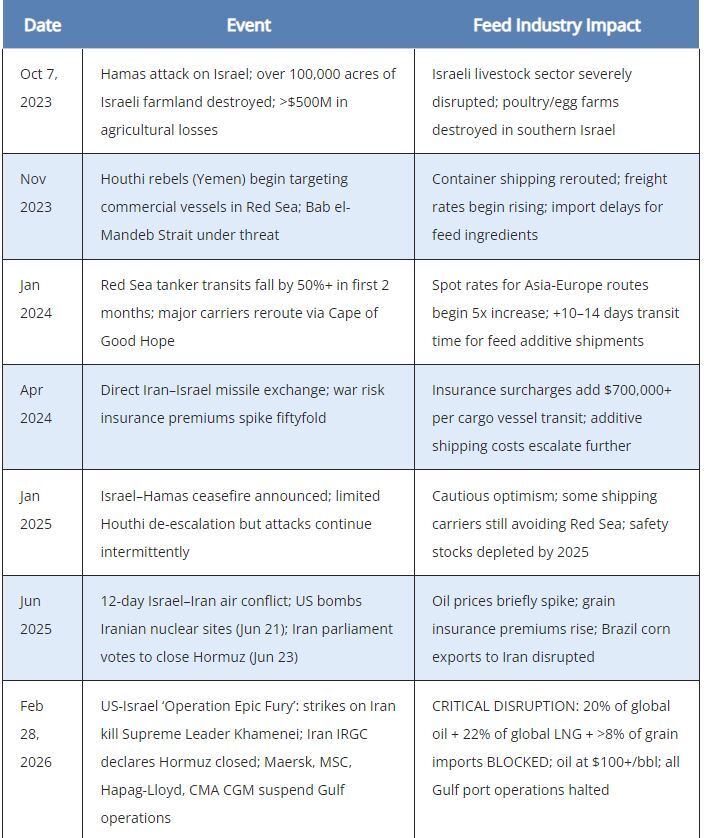 The current crisis is the product of nearly 30 months of sequential escalation. Understanding the timeline is essential for assessing the cumulative impact on the feed and animal nutrition industry.