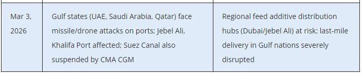 Jebel Ali (UAE) – the largest port in the Middle East and critical for regional feed additive distribution – is now under direct threat from Iranian missile/drone strikes (Mar 2026)