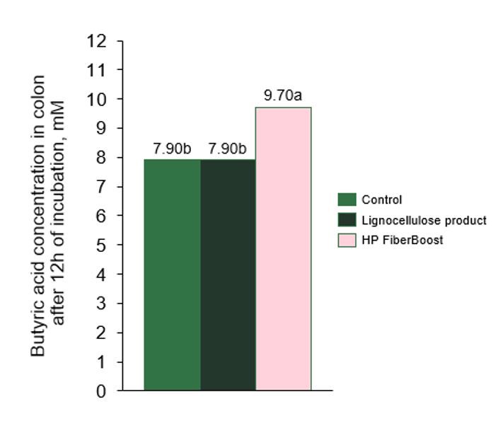 Figure 1 Concentration (mM) of the short-chain fatty acid (SCFA) butyric acid in colon digesta after 12 hours of incubation with no added fiber (control), HP FiberBoost or a lignocellulose product (Thirup et al., 2021).