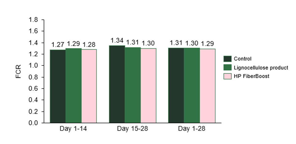 Figure 3 Feed conversion rate (FCR) of pigs when either fed a complex diet with various gut health promoting feed additives (control) or a simple nursery diet with a lignocellulose product or HP FiberBoost. Reference: (Rasmussen et al., 2022).