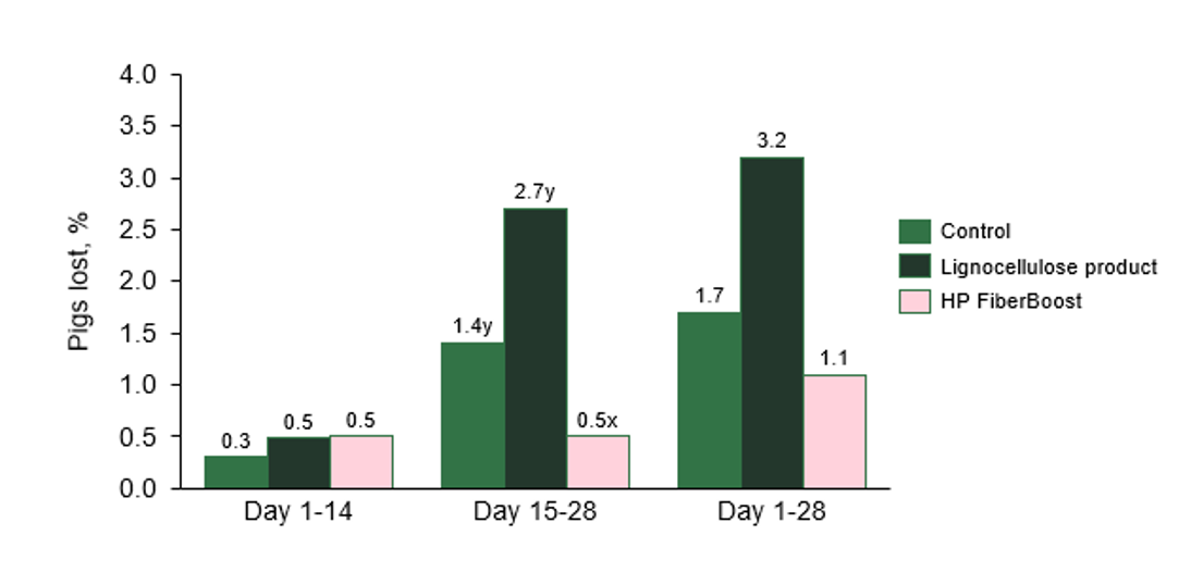 Figure 4 Pigs lost (mortality+removals, %) when either feeding a complex diet with various gut health promoting feed additives (control) or a simple nursery diet with a lignocellulose product or HP FiberBoost. x,y indicate a near-significant trend (p<0.10). Reference: (Rasmussen et al., 2022).