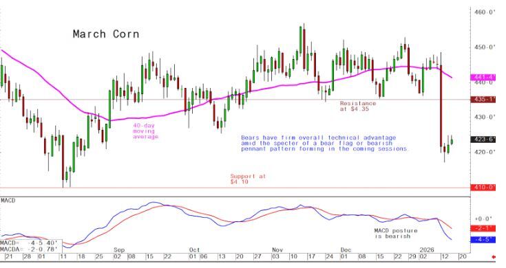 March corn futures--$4.17 1/4 to $4.30 and a sideways-lower bias