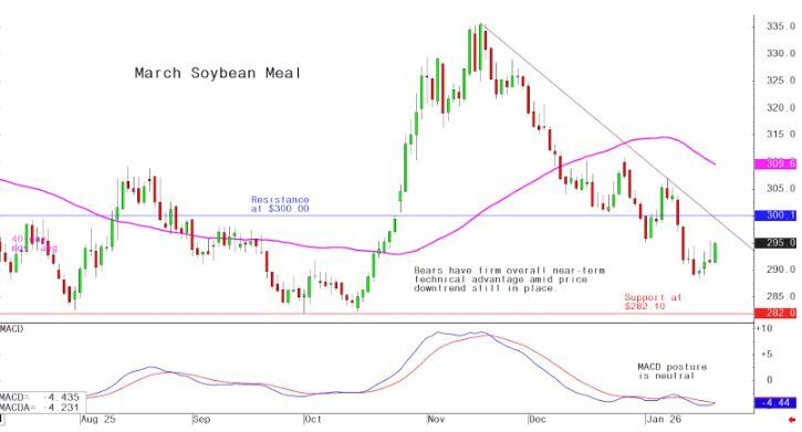 March soybean meal futures--$288.40 to $306.90, and with a sideways-higher bias