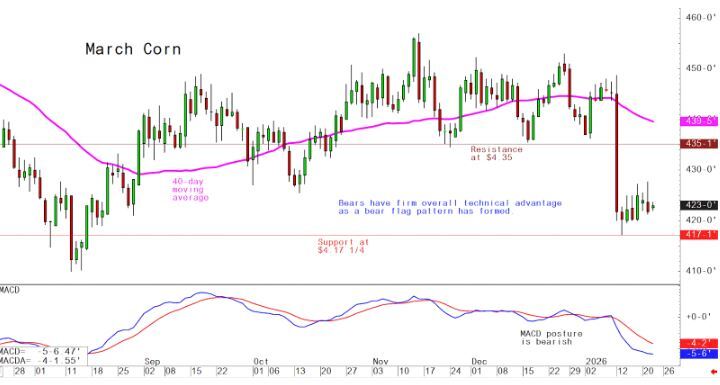 March corn futures--$4.17 1/4 to $4.30 and a sideways-lower bias