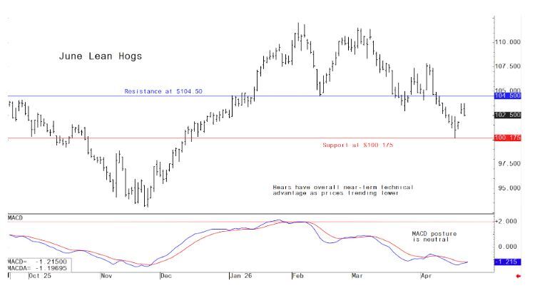 June lean hog futures--$100.175 to $105.00 and with a sideways-lower bias
