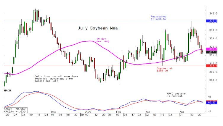 July soybean meal futures--$308.90 to $328.00, and with a sideways bias