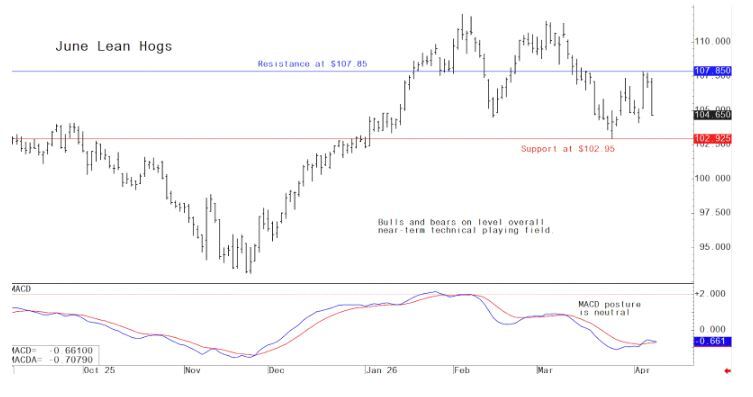 June lean hog futures--$107.85 to $102.95 and with a sideways bias