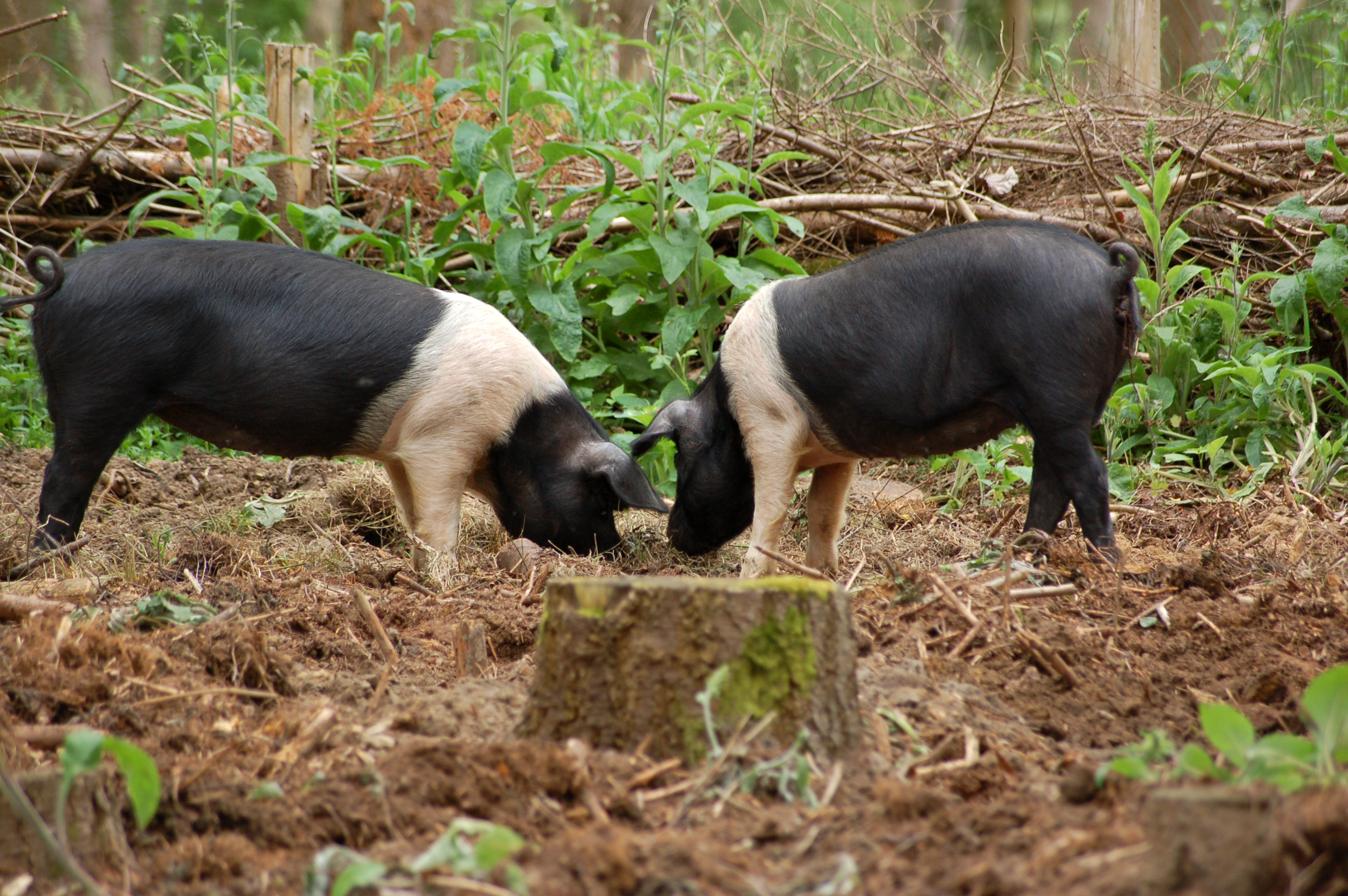 The Bazna is black and red with a white stripe around the middle. It is a highly adaptable breed, and will eat just about anything it is given, as well as breeding quickly with an average of nine piglets per litter. A sow can farrow between eight and twelve litters over their breeding lifetime. It immediately became popular because of these traits, especially as it bred quickly when compared to it's native, maternal breed. The Bazna pig presents medium height at the withers, and a body structure characteristic for fat meat production. The head is medium with slightly concave profile. The ears are also medium, forward placed, and the neck is short, wide and strongly attached. The trunk is of average width, quite deep and almost round, the top line of the body is slightly convex. This is a breed which is average in terms of size in almost every way. When this is coupled with the speed it breeds at, it's dietary requirements being essentially 'anything', and a quick growth time, it is easy to see why it is so popular.
