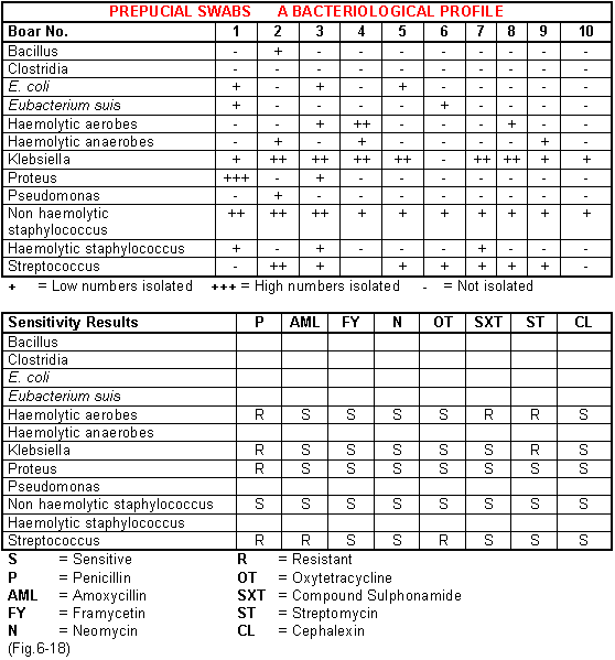 - Bacteriological examinations of preputial and vaginal secretions. All boars and 10 sows that have repeated should be tested. A swab is introduced into the prepuce either while the boar is eating, confined in a stall or just before dismounting after mating. Likewise in problem sows the lips of the vulva are cleaned with tissue, parted and a swab inserted to its full length. The predominating organisms in the herd can then be determined and antibiotic sensitivity tests carried out. Swabs from individual discharges are worth examining but the results are sometimes not helpful. However they will identify an organism such as klebsiella which is a primary pathogen in its own right. Fig.6-18 shows a typical laboratory result and some of the antibiotics that could be used. These results were obtained from a farm where 24% of served sows repeated and there was evidence of a tacky discharge 12-20 days post-service associated with some of the infertile sows. The bacteriological picture shows a high isolation rate of klebsiella bacteria from the prepuce of the boars (90%). The level in a normal herd would be less than 10%. Further examinations showed 30% of problem sows were carrying the same organism. Klebsiella is recognised as an opportunist pathogen and from the antibiotic sensitivity tests amoxycillin was selected as the medicine of choice for treatment. 3ml of injectable solution were deposited into the anterior vagina of all sows 6 - 24 hours after the last mating. This was carried out for a four month period and 7ml placed in the prepuce of each boar once every three weeks, on five occasions. The conception rate improved to 88%.