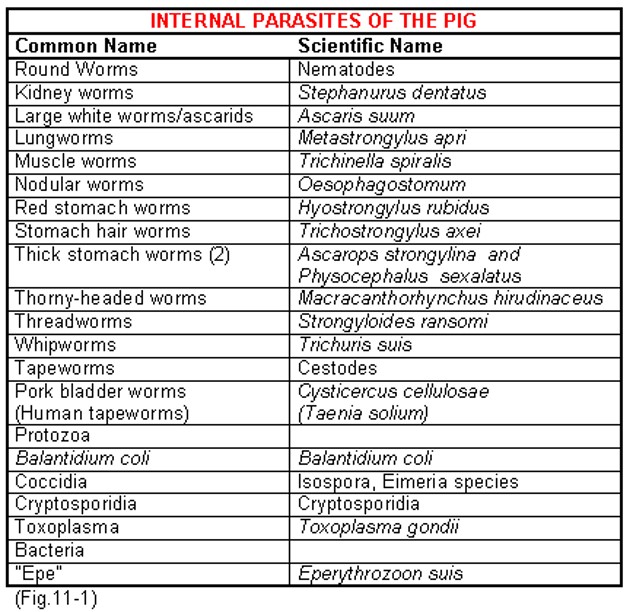 In the sow, the important parasites are the large white worms ascarids (Ascaris suum), red stomach worms (Hyostrongylus rubidus) and whip worms (Trichuris suis).