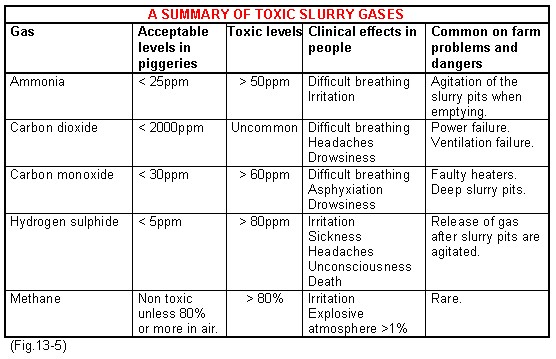 Methane gas is highly explosive when levels reach 1% or more, this is the main risk on farms. As a poison the gas is largely inert and would only cause problems to pigs if the levels were so high as to displace oxygen. This would take place above a concentration of 80% and the signs would be acute respiratory embarrassment.
