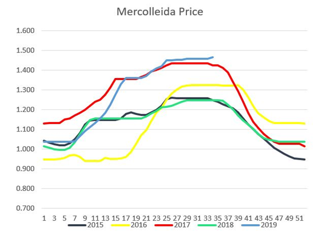But perhaps the most important marker of the market, is the piglet price. Currently a year ago the base price of Mercolleida was € 20 (US $22.20) and this year it is € 35(US $38.75), the sale price in August 2018 with premiums was € 37(US $41) and now it is € 58 (US $64.21), the highest price ever recorded this time of the year! This price indicates the optimism and confidence for the future of the industry. The piglets that are entering now in the feeder’s facilities are those that will be marketed mid November- past years price was € 1,038/kg liveweight (US 52.14¢/lb) and € 1,028/kg liveweight (US 51.64¢/lb)in 2018 and 2017 respectively. This big price difference shows where the market is today.