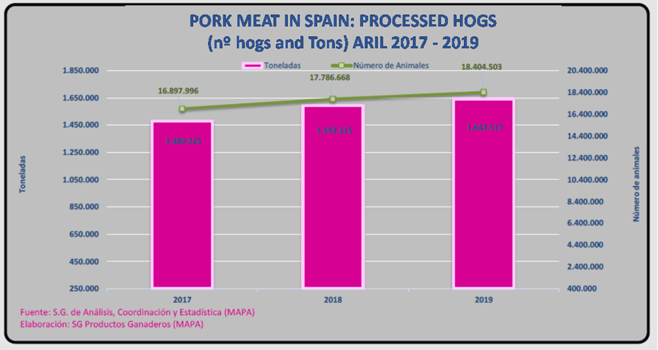 The EU pork supply is inferior to other years. In the first quarter of 2019 , the EU market has processed 350,000 hogs less than in the same period of 2018. Spain production has increased by just over half a million processed hogs, while Germany has dropped by 1 million hogs. There are fewer hogs, but more weight is sought.
