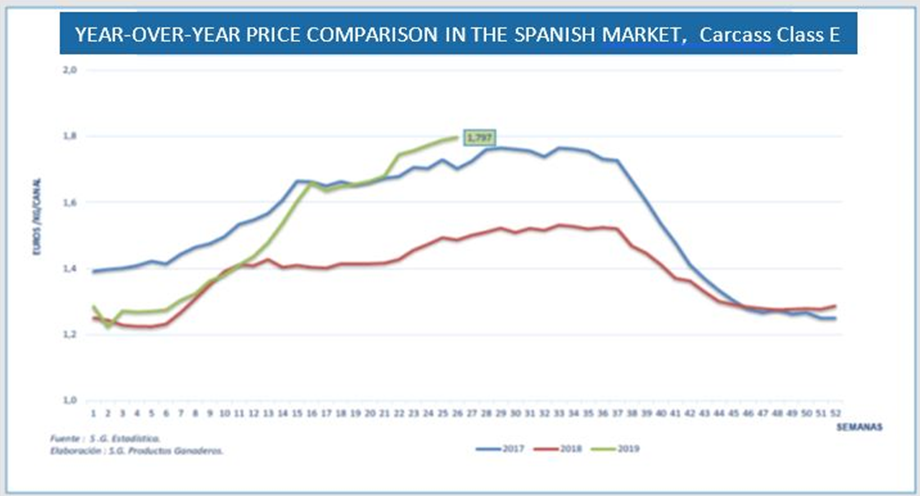 We are in the middle of August and we have the highest market price in the last five years.This rise began in mid-June and since a month ago when it reached 1,456€/kg of live weight (US 73.13¢/lb) has been unchanged until this, week when it reached 1,465€/ kg liveweight (US 73.13¢/lb). The previous years trend for lower summer prices has been broken al around Europe. A rise of 7 € cents/ kg in Germany with a price of 1,850€/kg of the carcass (US 93.01¢/lb). We also observe higher prices in Denmark, Belgium, and Italy.