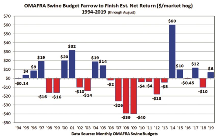 Similarly looking to 2019 hog year it is looking to be average at best. The table below compiled by OMAFRA shows the first six-month average net return at $3.90. Four of the nine months have been significantly negative values with the prospect of the fourth quarter more likely negative than positive.