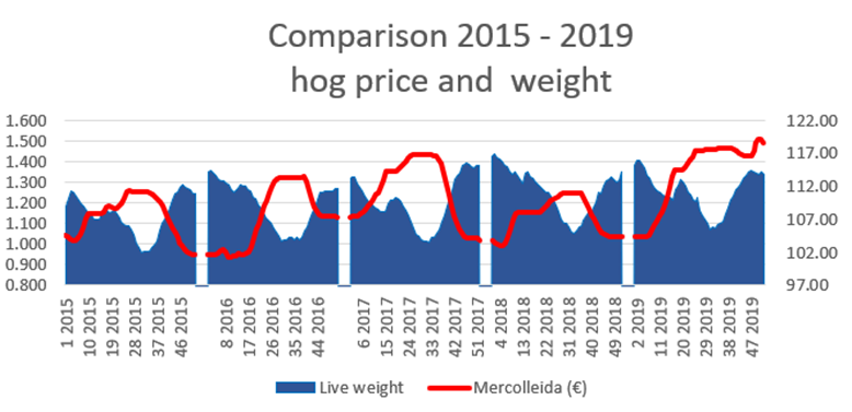 The 2019 Pork Spanish market had closed with values not seen in the last six years.In 2014 the year started with €1,253/kg live-weight (61.68¢ US /lb), which was already perceived as a very high value! Live-weight averaging at 109.33 kg (241 lbs) for the same year.