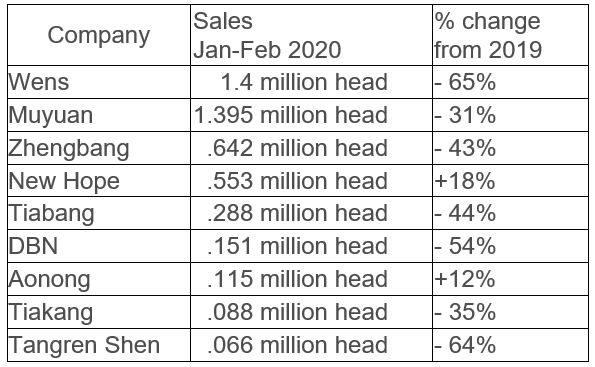 China has several publicly traded companies that report their hog sales. Below is a comparison between Jan-Feb 2019 and Jan-Feb 2020.