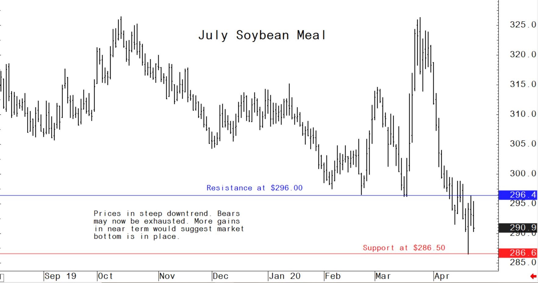 July soybean meal futures: $286.50 to $300.00, and with a sideways bias.