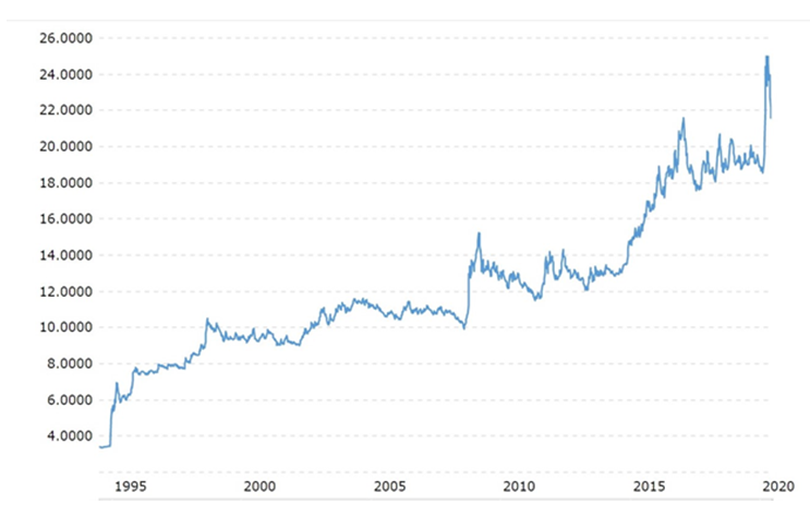 The Mexican Peso is another story – Mexican national currency removed all gains from 2019 after US President Donald Trump threatened to impose tariffs on goods exported from Mexico to the United States. The Mexican Peso lost as much as 3.62 percent in May 2019, touching its worst level so far of that whole year before erasing some losses. In 2020 has been even worse. Historically, the Mexican Peso reached an all-time high of 25.78 in April of 2020.