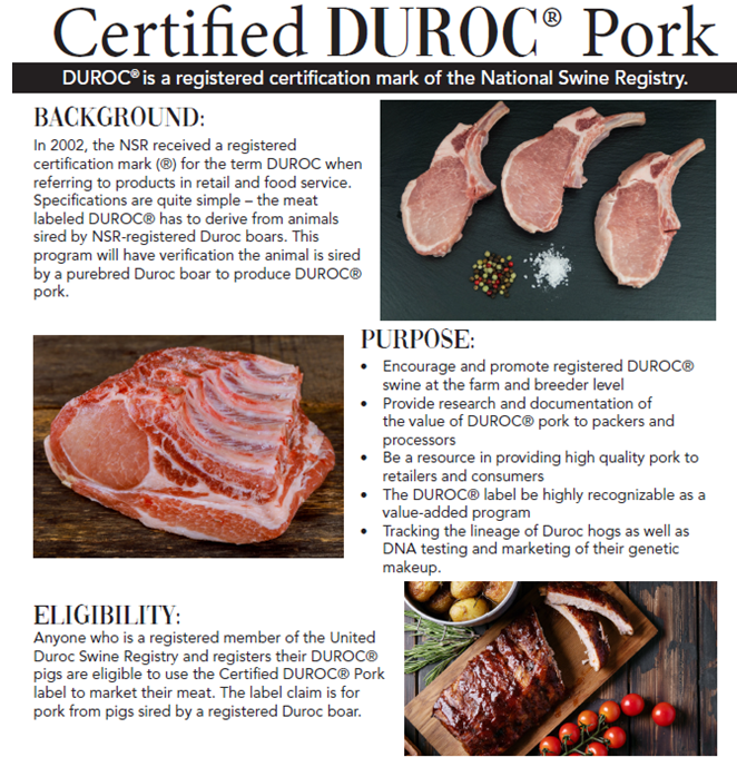 It’s one thing to rail against what’s wrong, but it’s more important to find solutions to unlock U.S. domestic demand. We all are aware of the run away success Certified Angus Beef and what it’s done for beef consumption and cattle producers. Fortunately for the pork industry the National Swine Registry (NSR) has trademarked “Duroc” for U.S. meat case. The Certified Duroc Program will be an option for producers, packers and supermarkets to use a program that through legal verification can brand a product that like Certified Angus not be a niche product but one that resonates to all consumers.