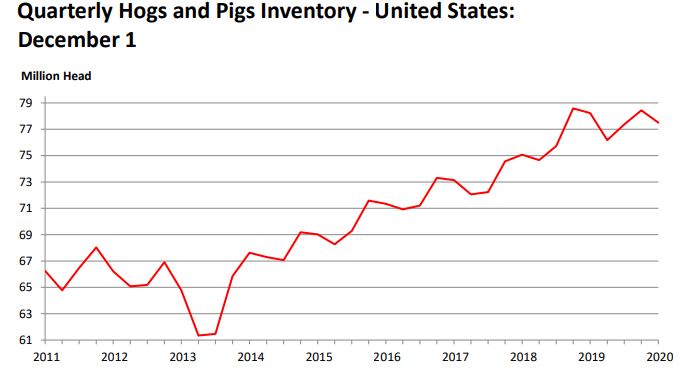 United States inventory of all hogs and pigs on December 1, 2020 was 77.5 million head. This was down 1% from December 1, 2019, and down 1% from September 1, 2020. Breeding inventory, at 6.28 million head, was down 3% from last year, and down 1% from the previous quarter.
