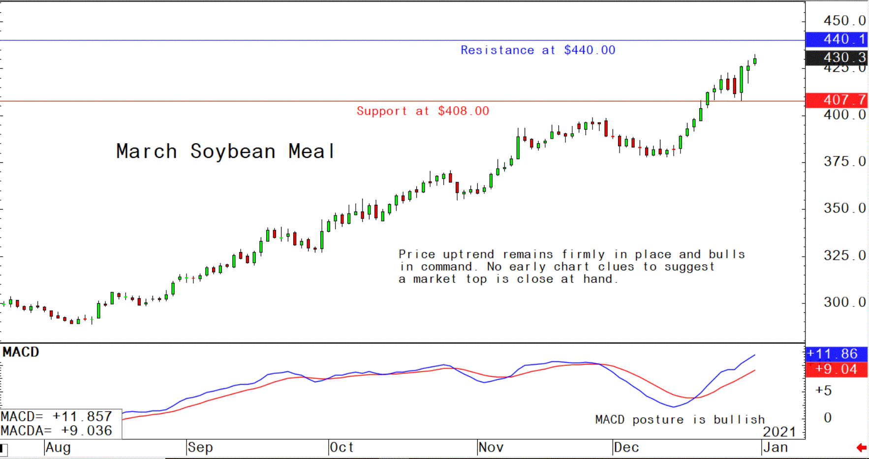 - March soybean meal futures--$420.00 to $440.00, and with a sideways-higher bias