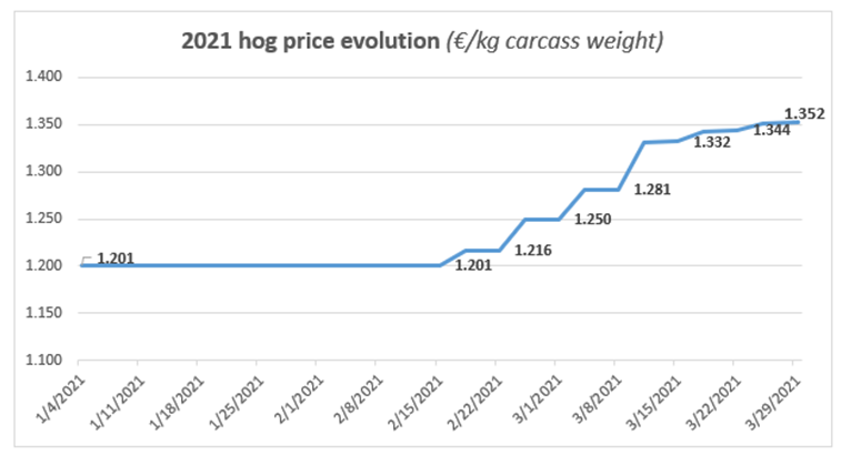 After a continuous decrease since September 2020, the hog price in France stabilized around the average price of 1.20 € per kg carcass from the beginning of December until mid-February of this year.