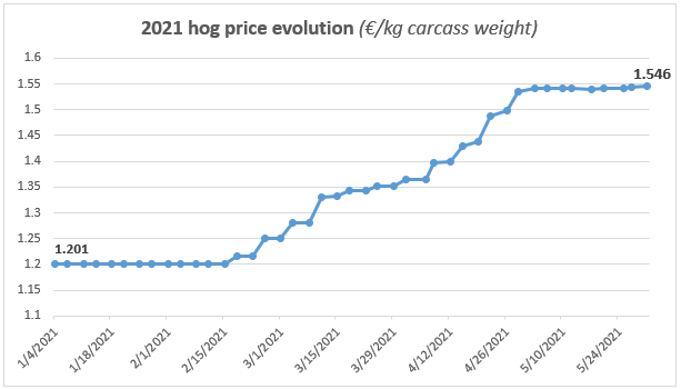 In recent days in France the weather is improving with good temperatures (after a rather cold and rainy spring), and restaurants will reopen after the COVID-19 pandemic. We can therefore expect that demand will be stronger, and hog prices will continue to increase.