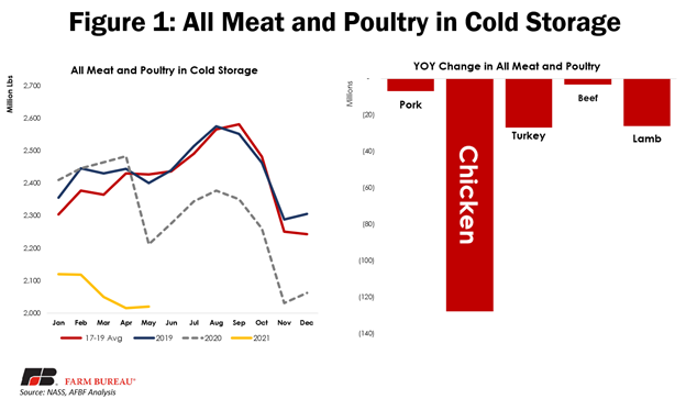 USDA’s latest Cold Storage report shows the animal protein supply chain still struggling with the impacts of COVID-19. At the end of May, total cold storage stocks of meat and poultry (excluding duck) came in at slightly above 2 billion pounds. This is approximately 190 million pounds, or 9%, below a year ago. The story in cold storage so far in 2021 is largely a chicken story, with the overall declines in red meat and poultry mostly being driven by a 130-million-pound reduction in chicken in cold storage.