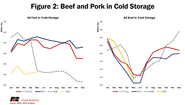 May is a month in which we have to take into account base effects when looking at year-over-year comparisons for pork. Compared to recent history, we are looking at very low levels of pork in cold storage, but due to the drop in May 2020 it is only registering as a 1% year-over-year decline. Total pork in cold storage was reported at 461 million pounds, a drop of just under 7 million pounds from last year.