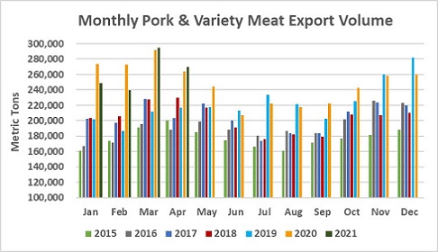 - After struggling last year, pork exports to Colombia are making a strong recovery in 2021. April shipments exceeded year-ago levels for the third consecutive month, pushing January-April exports 29% above last year’s pace in both volume (32,762 MT) and value ($73.9 million).