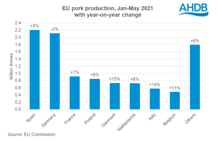 For the first five months of the year, EU pork production totalled 9.9 million tonnes, which was 5% more than the same period a year ago. Clean pig slaughter was 4% higher year-on-year at 103.87 million head, indicating that carcase weights have been heavier. Lower production in the early part of 2020, affected by COVID-19 disruption, contributed to the year-on-year increases seen in 2021.