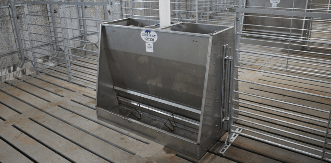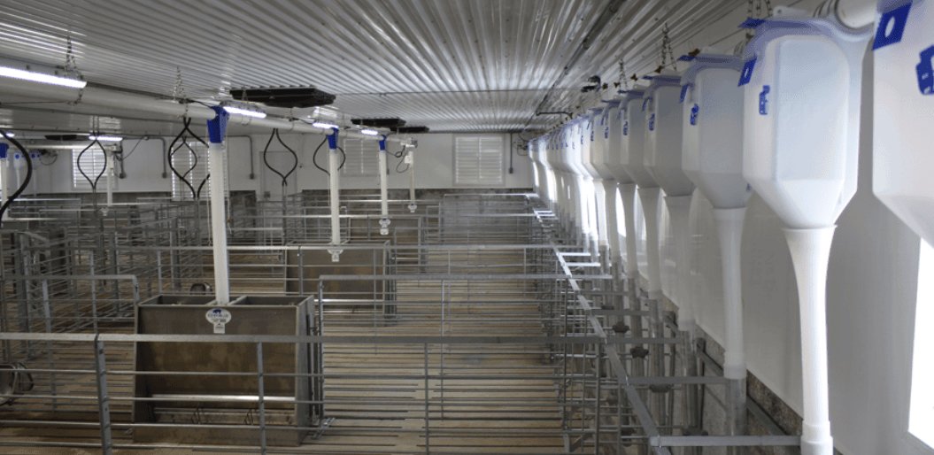 Stanchion stalls with Sow Drops provide automated limit feeding.
