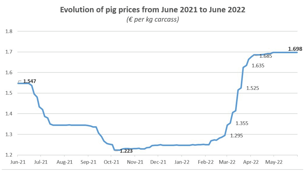 After a sharp rise in the hog market price for a few weeks between February 28 and May 7 (+0.39 € per kg carcass), the price has not changed in the last 5 weeks and remains at 1.698 €.