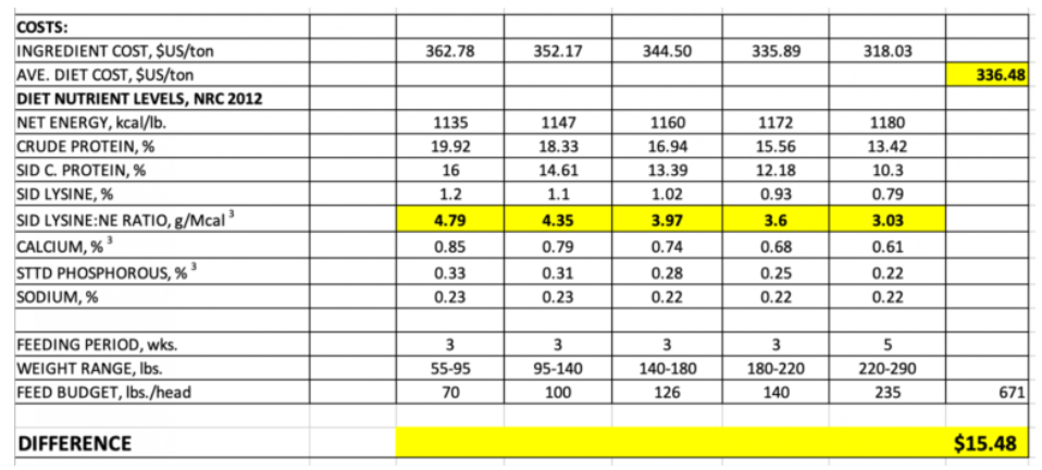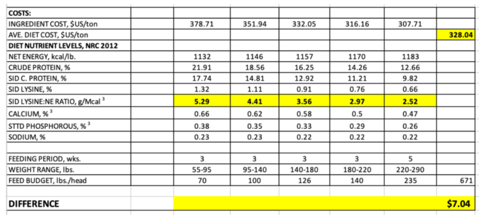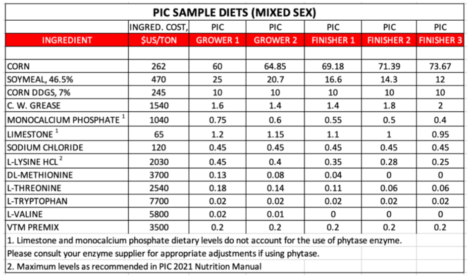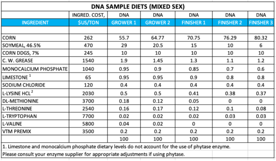 Assumptions: Corn – $262/ton ($6.65 bushel); Soymeal 46.5% – $470/ton; Corn DDGS 7% – $245/ton; C.W. Grease – $1540/ton. See the tables below for diet details and costs.