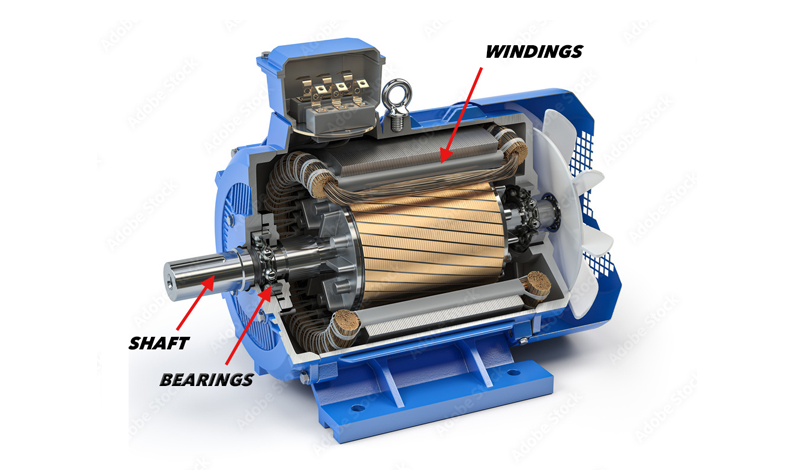 Inside a motor, there is a band of copper wire called the windings. As current flows through the windings, it creates a rotating magnetic field, causing the motor shaft to rotate. The motor will continue to operate if the windings receive a steady, stable electrical supply. Insulating varnish is applied to the windings to ensure electricity flows through the entire coil. Without this insulation, the current would flow across the wires, causing a short circuit.