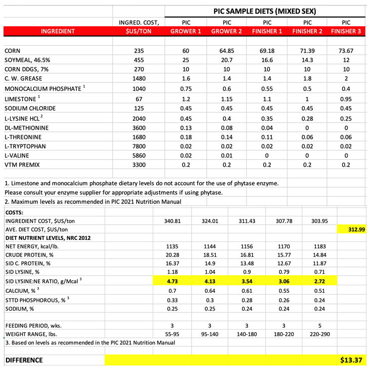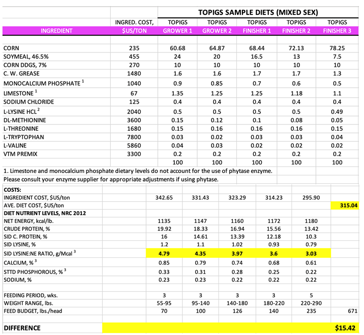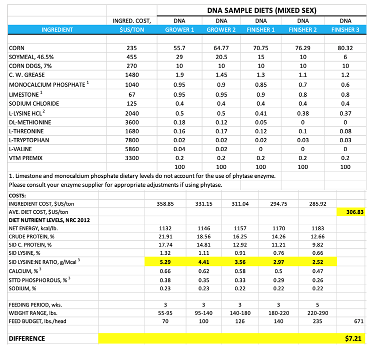 Assumptions: Corn - $235/ton ($6.39 bushel); Soymeal 46.5% - $455/ton; Corn DDGS 7% - $270/ton; C.W. Grease - $1480/ton. See the tables below for diet details and costs.