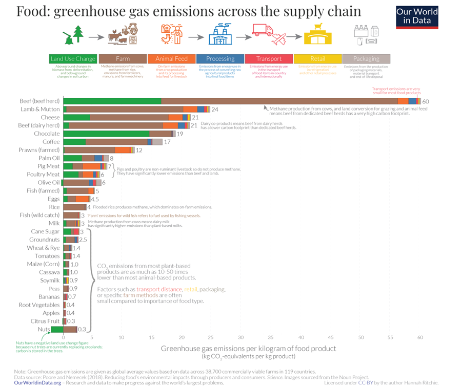 Take careful note of the greenhouse emissions from pigs vs Coffee and Chocolate – which are both 3 time higher per kg than pork! We are told one of the reasons meat consumption is falling is because of its environmental impact.