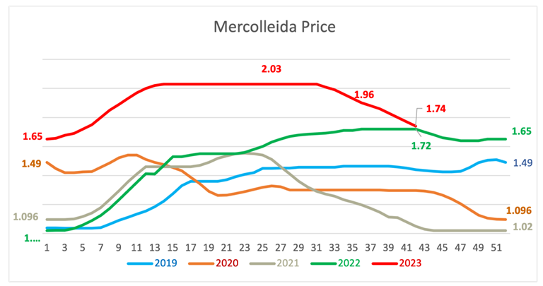 Market price analysis from Genesus GeneticsWe had been for 13 weeks with a value never seen (2.03 € / kg live) and in a few weeks we are at values like a year ago 1.74 € / kg live. In eleven weeks, the price has been falling until this week that has not been agreed at the "table of Mercolleida! And it has had to be the Governing Board of Mercolleida that has set the price...