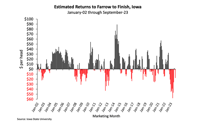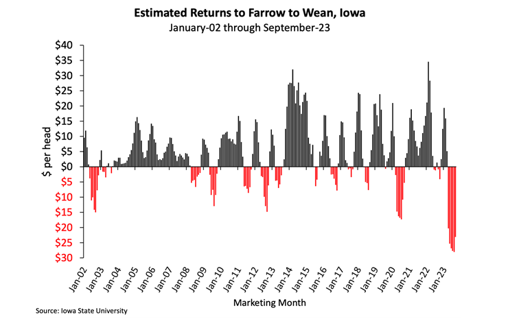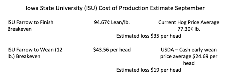 Using Iowa State University (ISU) costs current loss per head about $35 farrow to finish and early wean loss $19 per head. ISU data shows early wean losses from April until now (7 months) have averaged near $25 per head.
